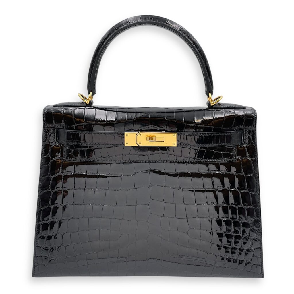Sellier Kelly 28 Black in Shiny Niloticus, Gold hardware