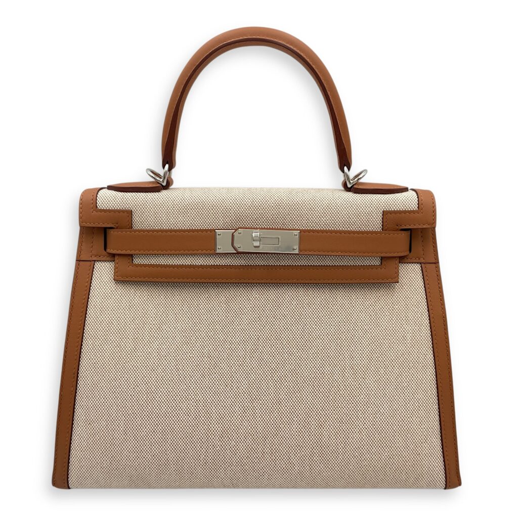 Sellier Kelly 28 Gold/Beige-Ecru in Swift/Toile, Palladium hardware