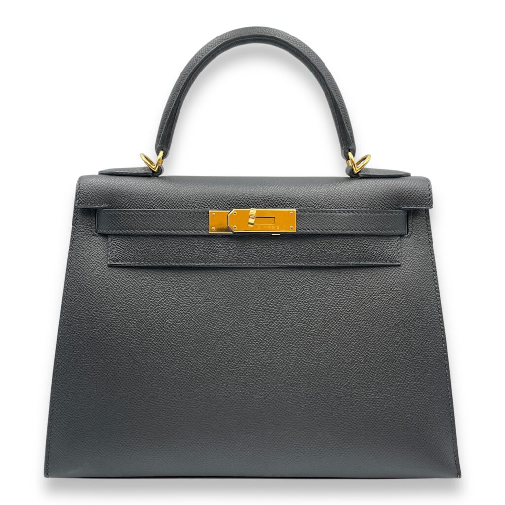 Sellier Kelly 28 Gris Etain in Epsom, Gold hardware