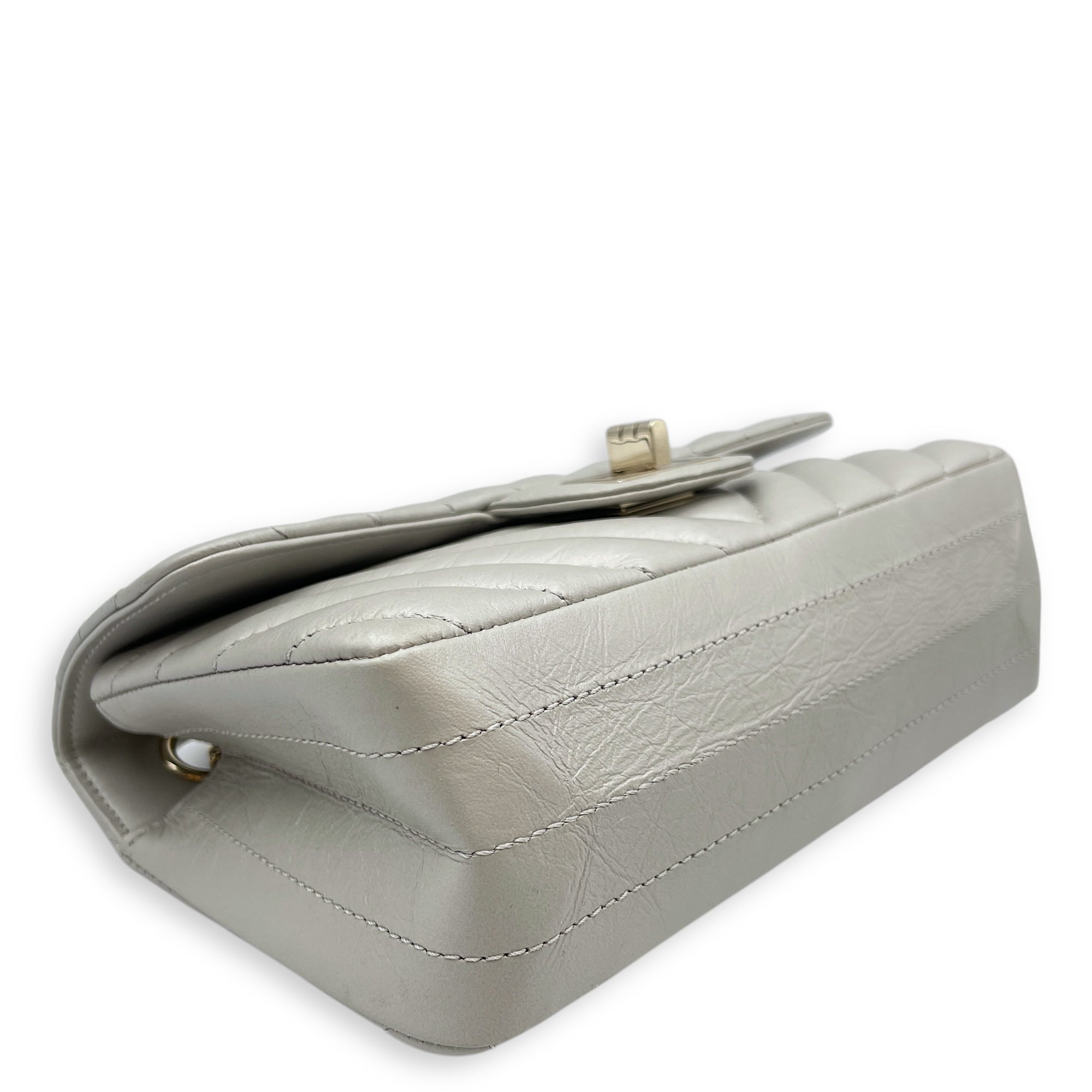 Chevron 22.55 Reissue Mini Metallic Grey Crossbody Bag in Lambskin, Gold hardware